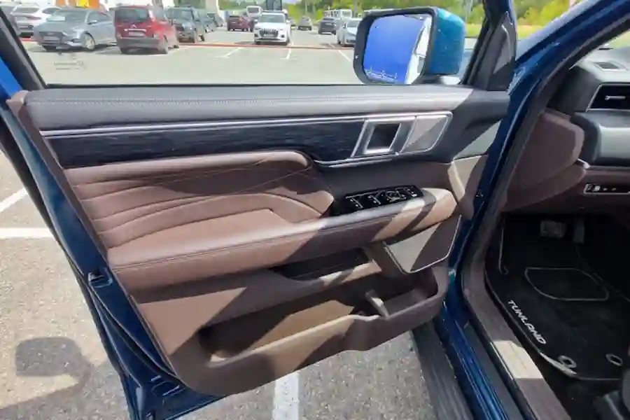 Полноприводная трансмиссия TUNLAND V7 заслуживает отдельного разговора. Полный привод Borg Warner с раздаточной коробкой передач предлагает не только жестко зафиксированные режимы заднего, полного и полного привода с понижающим рядом, но и автоматический режим работы 4х4, когда передний мост включается в работу сам при пробуксовке задних колес. Под правой рукой водителя есть не только шайба переключения режимов 2H, 4H, 4L и AUTO, но и вторая шайба где можно выбрать режимы снег, песок, спорт и другие варианты настройки работы трансмиссии.