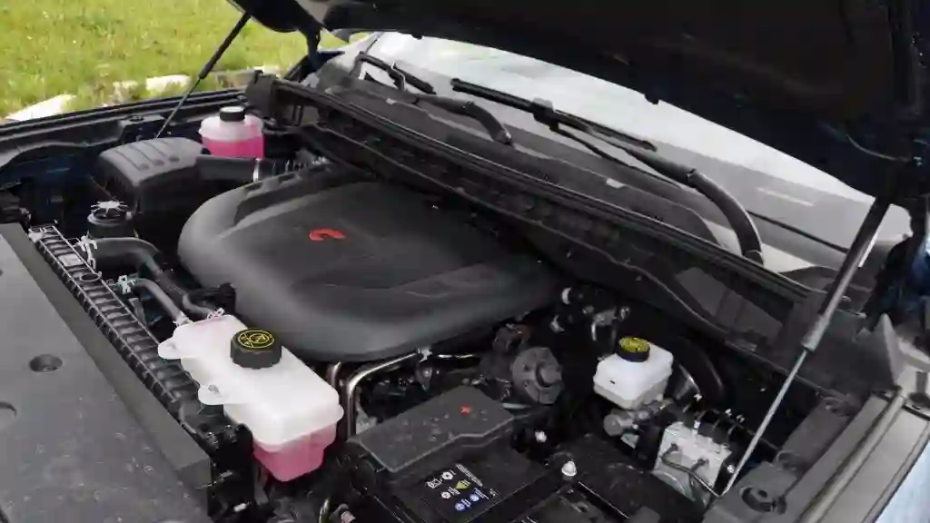Суммарный крутящий момент силовой установки составляет 470 Нм, для пикапа этого хватает, но не сказать, чтобы с лихвой. Трехлитровый бензиновый V6 EcoBoost оригинального Ford F-150 развивает 405 л. с. и 583 Нм. У «американского» пикапа из Китая такого мотора нет и в помине, здесь первую скрипку играет двухлитровый турбодизель Aucan 4F20TC мощностью 159 л. с., крутящим моментом 410 Нм. В помощь ДВС есть 48-вольтовый электромотор, он добавляет 60 Нм крутящего момента. Как и положено гибриду, система имеет функцию рекуперации энергии. По оценке производителя, она обеспечивает экономию топлива до 8 %. Не так и мало, учитывая, что топливный бак один и его объем 76 л.